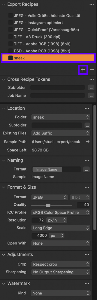 6. Create a new „Export Recipe“ by pressing „+“ and name it „sneak“. Now you can select your export Settings, like folder and image size. For the Folder choose the hot folder you selected in sneak.